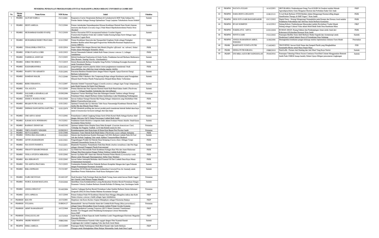 Jambi, 20 Agustus 2025 – Program Studi Farmasi, Fakultas Kedokteran dan Ilmu Kesehatan (FKIK) Universitas Jambi menorehkan capaian membanggakan pada ajang Program Kreativitas Mahasiswa (PKM) 2025. Sebanyak 11 judul proposal dari mahasiswa Farmasi dengan NIM G1E berhasil lolos pendanaan Universitas Jambi melalui Lembaga Penelitian dan Pengabdian kepada Masyarakat (LPPM UNJA). Ketua penelitian mahasiswa yang berhasil lolos pendanaan tersebut adalah: Tesalonika Finetua (G1E122016), Syiki Fuasya Lubis (G1E123033), Elkhairiannisa (G1E122012), Jessica Wanda Nuru (G1E123020), Bilqis Putri Aulia (G1E122021), Dhimas Danuartha Saputra (G1E122070), Setya Karina (G1E123006), Asyifa Ramadhani (G1E123021), Firanty Khairunnisah (G1E123013), Viola Ayudya Miranda (G1E122042), dan Ria Herawati (G1E122043).